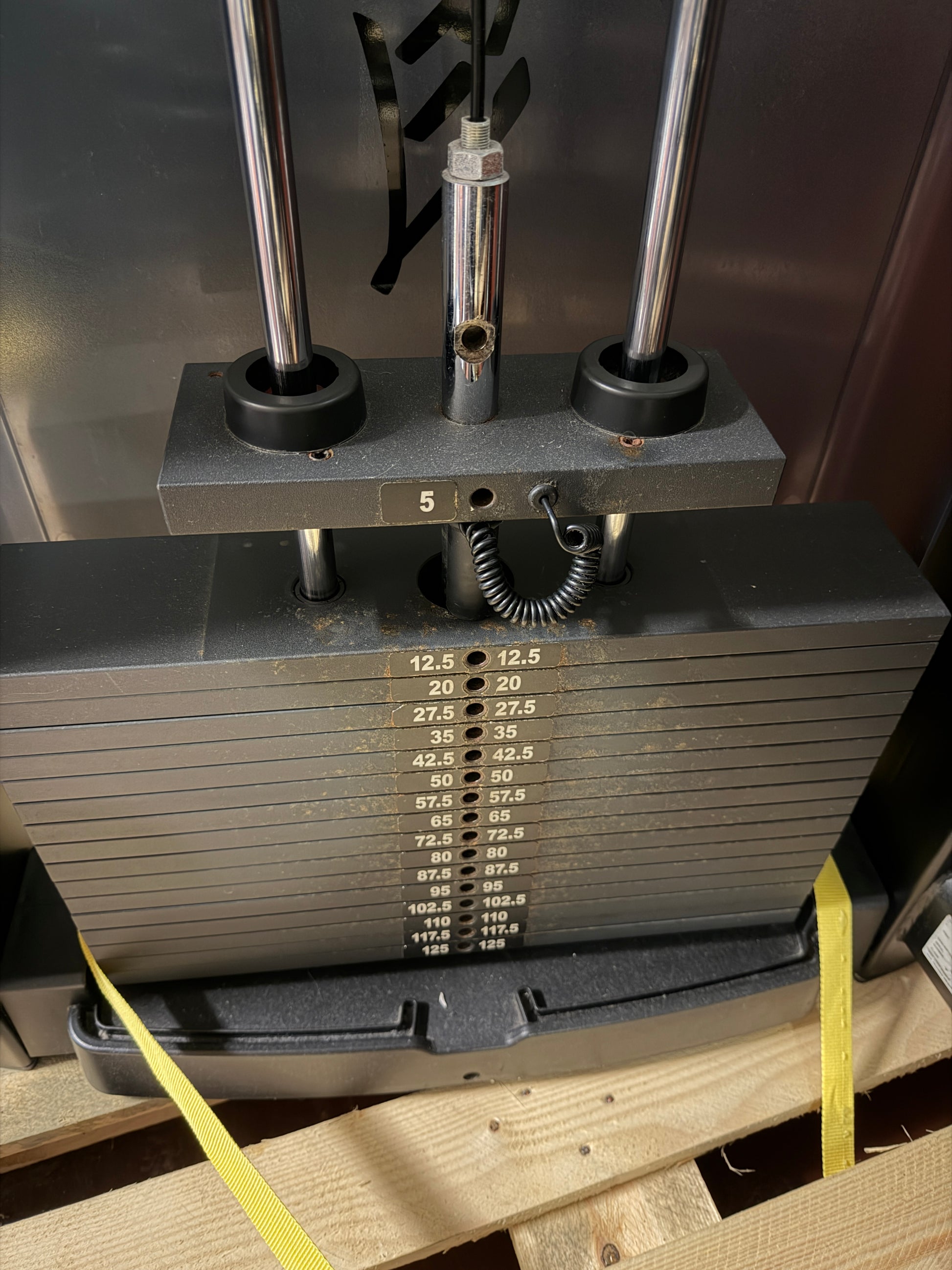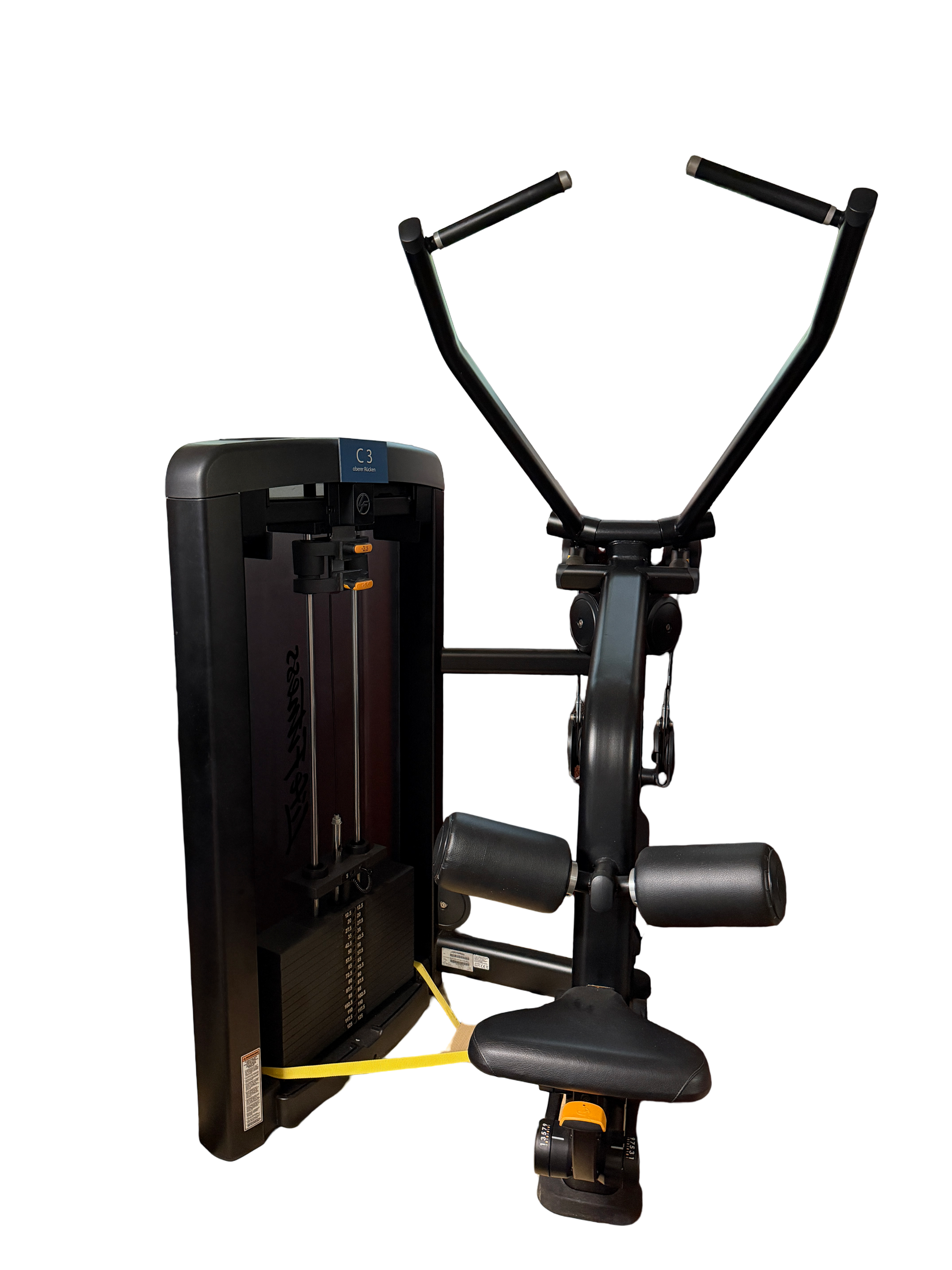 Professionelle Rückenzugmaschine für das Training des oberen Rückens und der hinteren Schultern. Mit verstellbarem Sitz, gepolsterten Rollen und einem Gewichtsblock bis 125 kg. Robuste Studioqualität von Life Fitness, technisch einwandfrei, minimale Gebrauchsspuren.