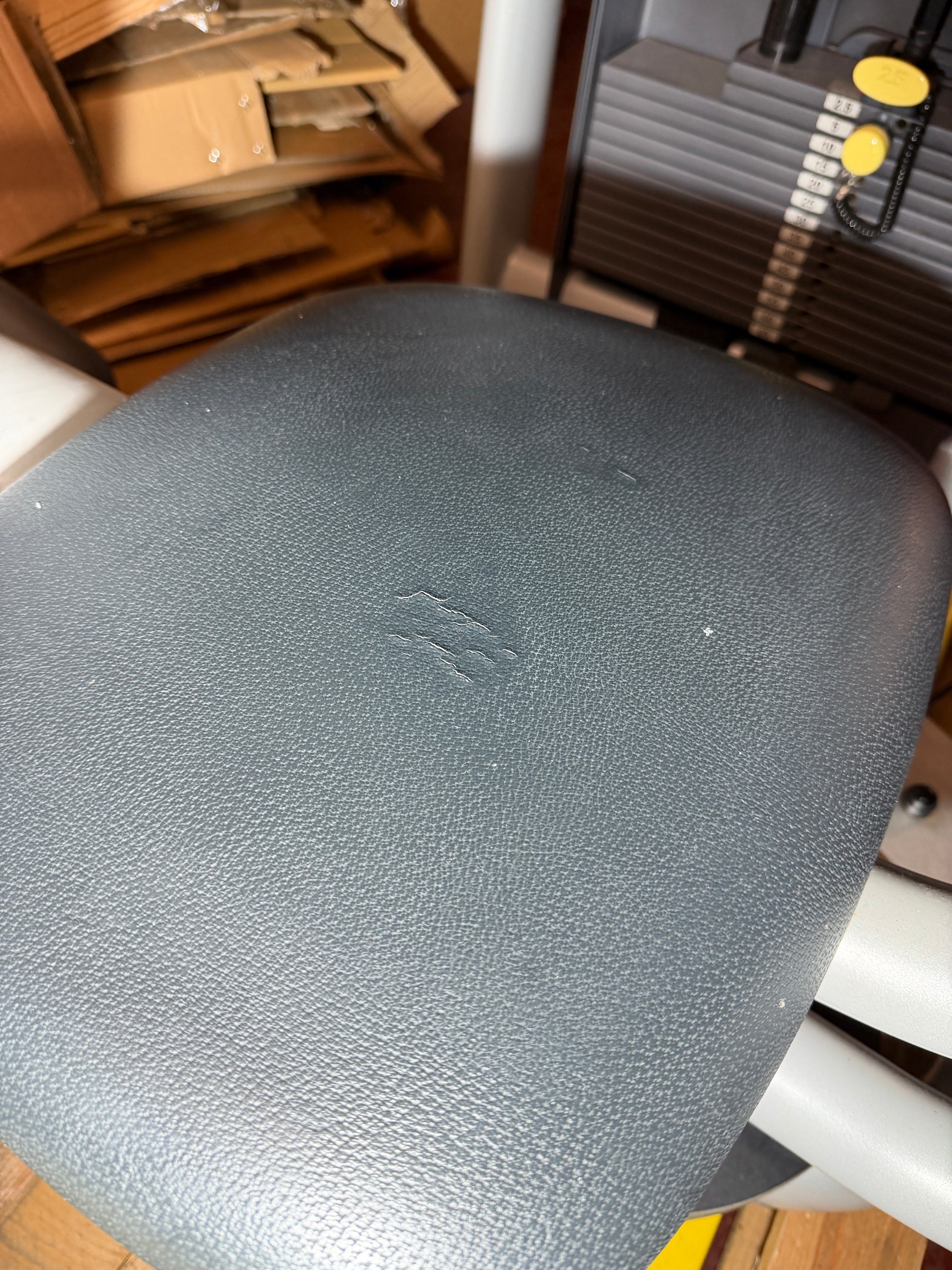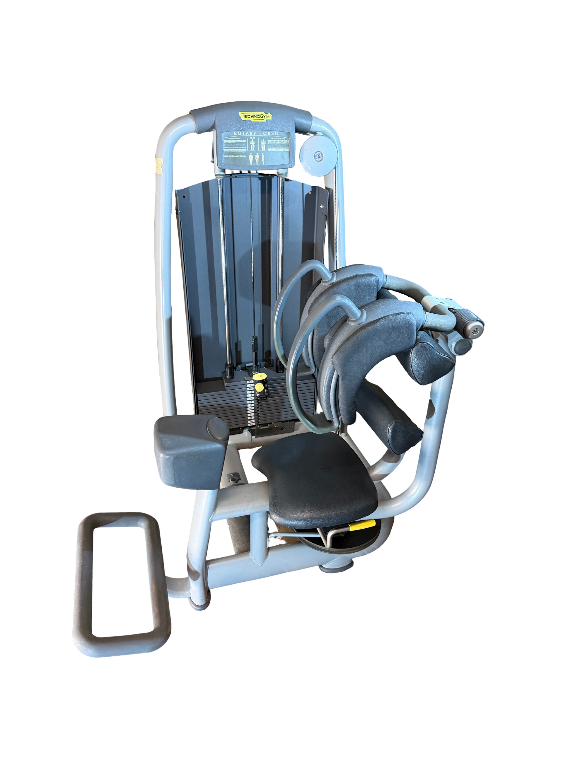 Professionelles Gerät zur Kräftigung der seitlichen Rumpf- und Bauchmuskulatur. Die Rotary-Torso-Maschine bietet eine verstellbare Startposition, gepolsterte Armauflagen und einen Gewichtsblock bis 65 kg. Robuste Studioqualität von Technogym, voll funktionsfähig, mit leichten Gebrauchsspuren am Sitzpolster.